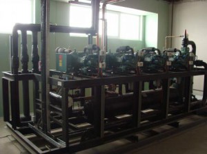 Зона охлаждения в логистическом комплексе, общей площадью 4800 м2. Системы охлаждения на фреоне, суммарная холодильная мощность 550 кВт.